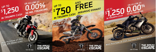 The Great Escape promotion offers bold incentives for riders to escape high interest rates on the purchase of a new Triumph motorcycle, with the lowest financing rates in the industry.