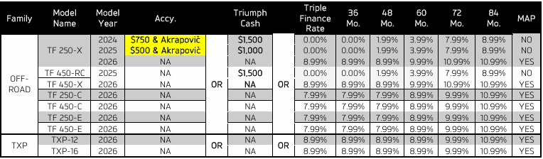 For February, customers are offered the choice of Triumph cash OR special financing incentives on select models. The TF 250-X models are now offered an Akrapovič exhaust and changes have been made to financing on select models, which have been highlighted in yellow.