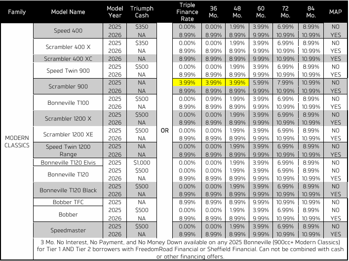 Triumph Triple Financing or Traditional Financing with rates as low as 0.00% APR for 36 months on select models with FreedomRoad Financial are eligible for both Tier 1 AND Tier 2 applicants.*** Triumph Triple Financing also available for a 24-mo. term on 400cc models only.